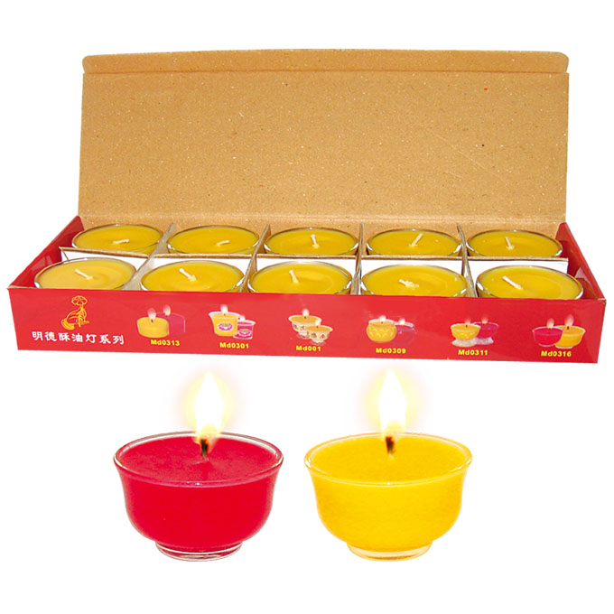 产品名称:茶杯酥油灯 产品编号:MD0316A 燃烧时间:8小时 规格:R=5.1cm H=3.2cm 包装数:彩盒300盏/件