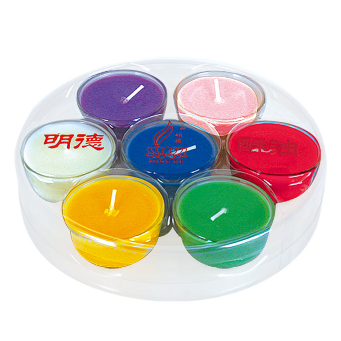 产品名称:七彩茶杯酥油灯 产品编号:MD0316B 燃烧时间:8小时 规格:R=5.1cm H=3.2cm 包装数:吸塑294盏/件