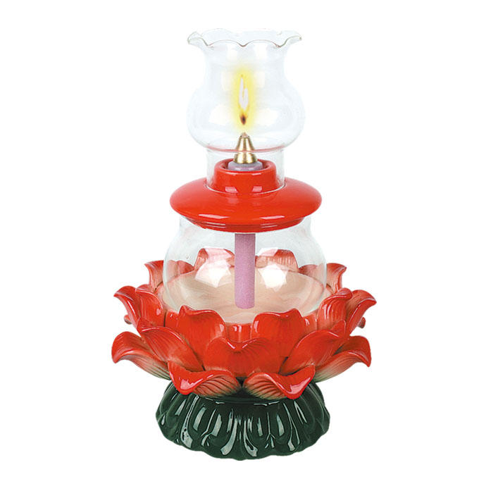 产品名称:妙心莲过滤油灯5号(旗红) 产品编号:MD-0528A 产品规格:R=6cm H=22.5cm 底座R=10.5cm 包装数:12套/件