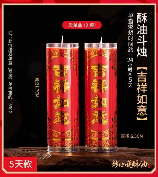 产品名称:妙心莲五天斗烛 产品编号:M0905 燃烧时间:五天 规格:R=6.5cm H=22.5cm 包装数:彩盒18对/件